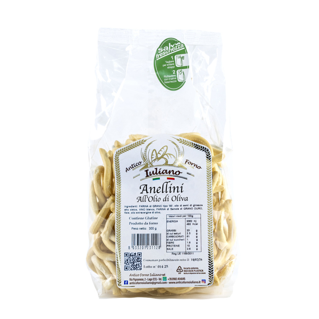 Gli Anellini all’Olio d’Oliva di Antico Forno Iuliano sono uno snack salato dal profilo genuino, arricchito con olio extravergine di oliva (1,8%) che dona un retrogusto fruttato e rotondo. Ideali come aperitivo, accompagnamento a salumi e formaggi, o per arricchire insalate e buffet professionali.